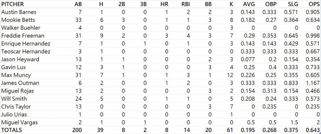 從上面的數據來看可以看出達比修有對戰道奇現階段打者的表現相當不錯,甚至好幾位強力打者(Mookie Betts、Will Smith、Max Muncy) 對戰達比修有在不少對戰打數當中都發揮的不是太好。不過以他們都是道奇隊目前陣中的主戰打者來說,基本上還是會將他們排在韓國開幕賽 G1 的先發打序當中。
