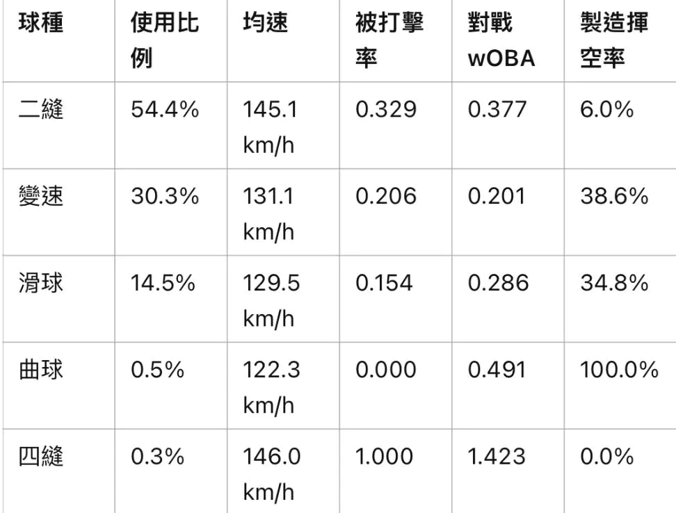 (Ps. 這些資料不包括他6月4日面對味全龍時的投球,因此並不是最新的數據,但可以大致看出他各種球種的表現狀況)