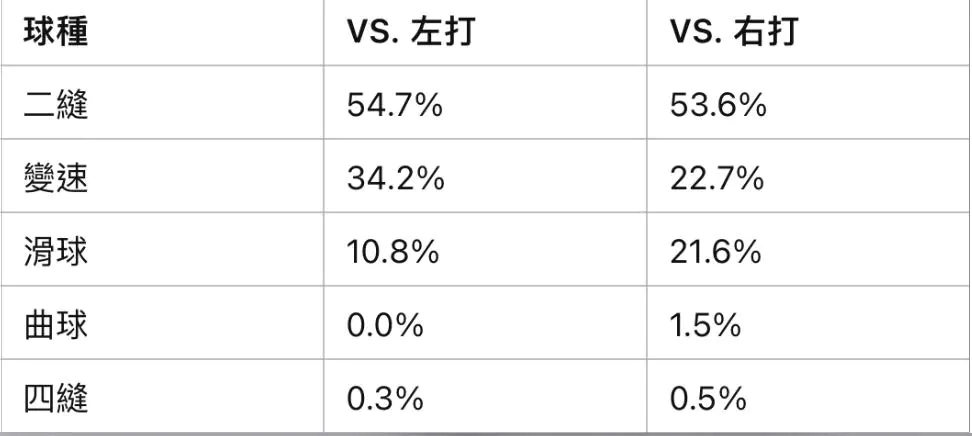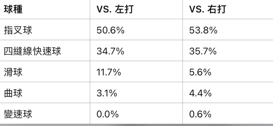 另外,布藍登面對右打者時使用的變化球種類更多,配球策略也更加靈活,這與他面對左打者時的配球策略有顯著差異。這也可能是布藍登本季對右打者壓制力明顯高於左打者的重要原因之一。
