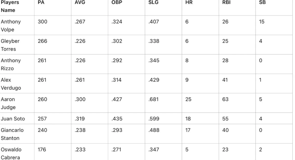 目前洋基隊在進攻端相較可惜的是第四棒的表現。本季洋基隊四棒的整體 OPS 僅 0.611,排在聯盟第 28 位,上壘率甚至是全大聯盟最低的 0.264。如果能夠修正這項問題,將對前段棒次(尤其是 Aaron Judge)起到更多的保護作用。