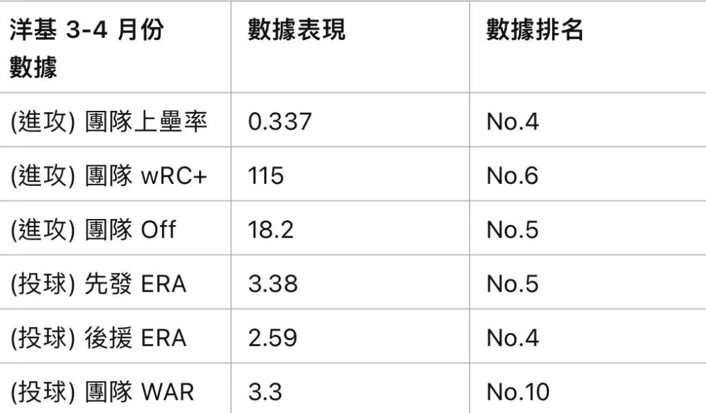以下是洋基隊在 3-4 月份的整體表現