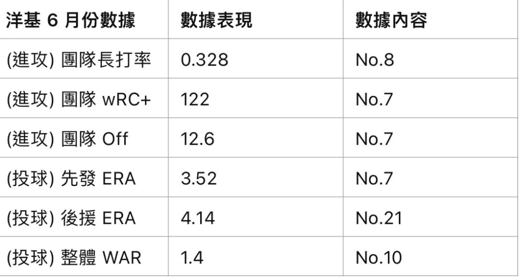 以下是洋基隊在 6 月份的整體表現