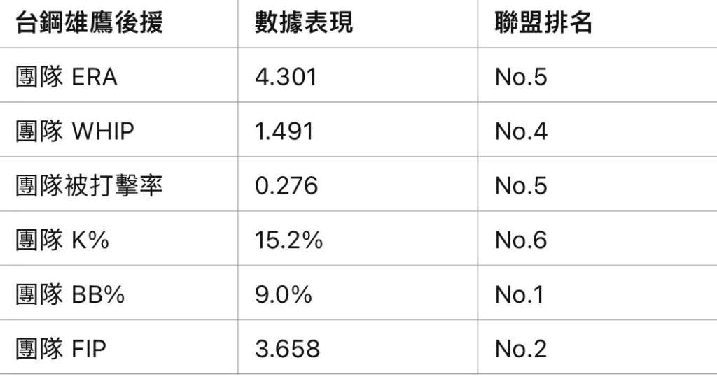 以下是目前台鋼雄鷹後援投手整體數據表現