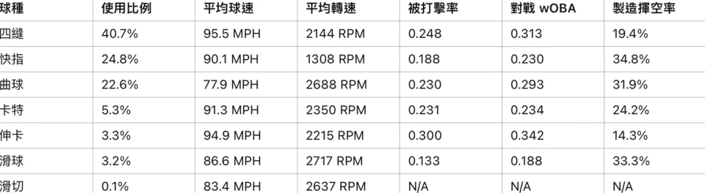 以下是 2024 山本由伸在 MLB 各種球路發揮的狀況:
