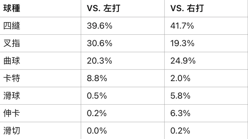以下是山本由伸面對左、右打者各種球路的使用比例: