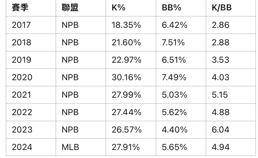 以下是他 2017-2024 年的三振率(K%) 和四壞保送率(BB%), 以及 K/BB 值