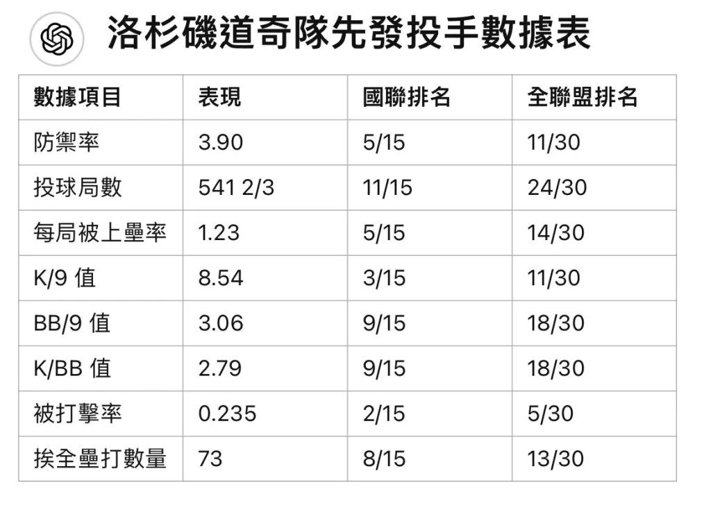 以下是洛杉磯道奇先發投手的數據排名: