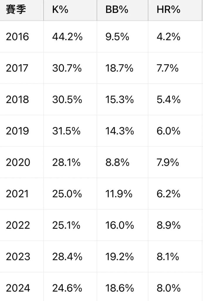 以下數據是從 2016-2024 整理他九個賽季的棒球生涯數據