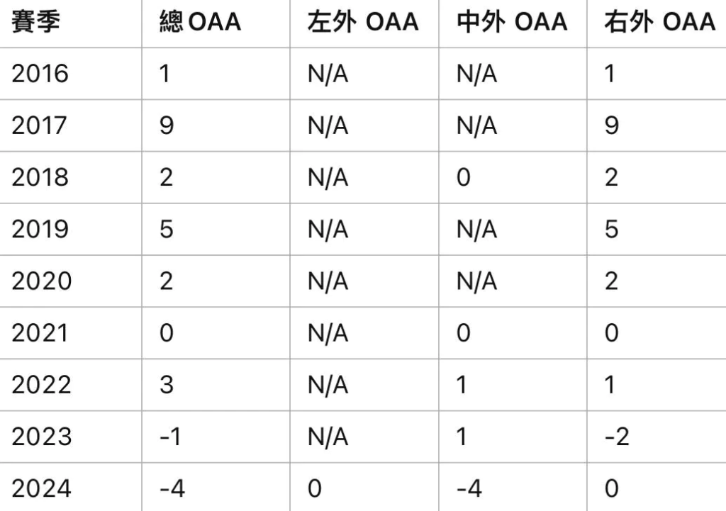 OAA (Outs above average) : 外野OAA能顯示,一名外野手比一般平均的外野手多接殺幾球。不只考量到外野手完成和沒完成多少接殺,也考量到每個接殺事件的難度。(定義來源 / 大聯盟小百科)