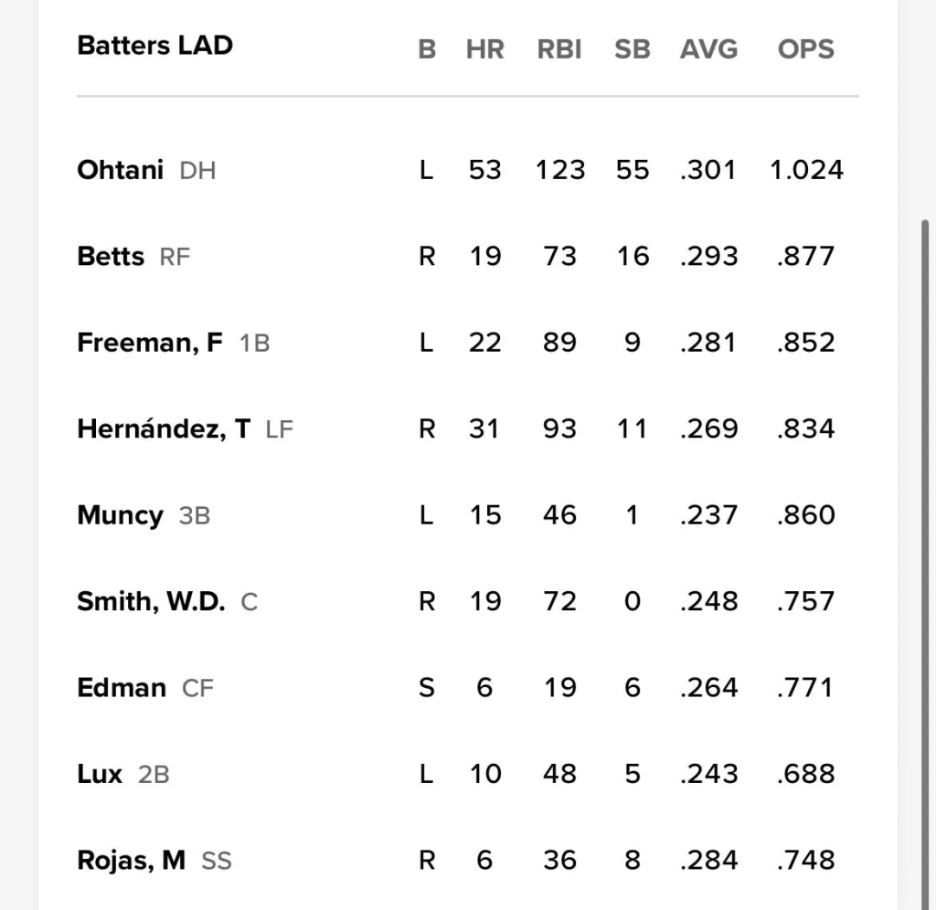 九月份,道奇隊絕大多數的球員 wRC+ 都高於 100,而本場比賽的先發打序中,唯獨 Gavin Lux 的 wRC+ 低於 100,數據為 59,其餘打者皆超過 100。其中表現最為突出的選手是大谷翔平(Shohei Ohtani),九月份的 wRC+ 高達 219,這段期間他擊出了 9 發全壘打、25 分打點,並成功盜壘 12 次,有機會挑戰單季 55 轟 55 盜的紀錄。此外,Teoscar Hernandez、Max Muncy、Tommy Edman 和 Mookie Betts 在九月份的 wRC+ 也都達到或超過 130,分別為:Teoscar Hernandez (wRC+ 181)、Max Muncy (wRC+ 143)、Tommy Edman (wRC+ 132)、Mookie Betts (wRC+ 130)。