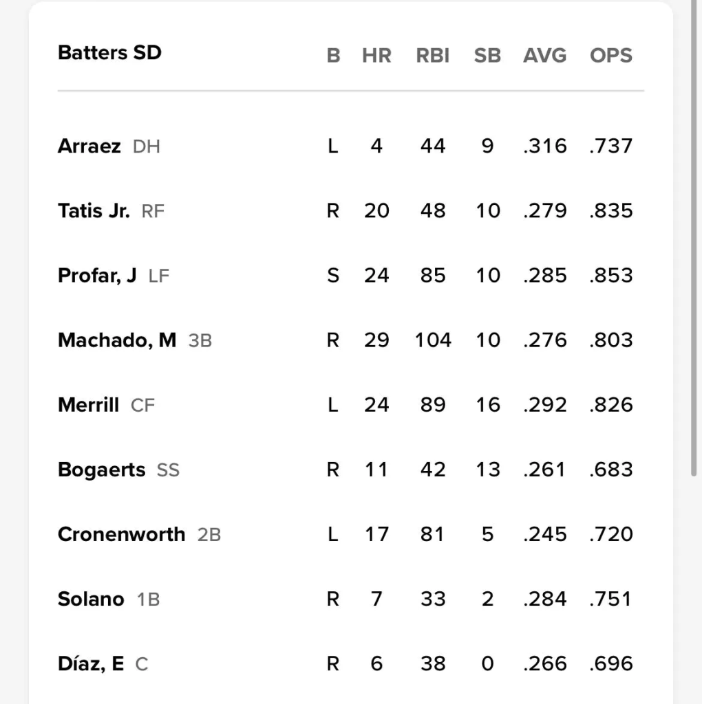 此戰前,教士隊的先發九人中,有 4 人的九月份 wRC+ 超過 140,分別是 Jurickson Profar(wRC+ 161)、Jackson Merrill(wRC+ 160)、Fernando Tatis Jr(wRC+ 146)、Manny Machado(wRC+ 145)。而在這九人中,僅 Jake Cronenworth (wRC+ 91)和 Donovan Solano (wRC+ 90)的九月份 wRC+ 低於 100,但他們的數據也達到至少 90。整體來說,教士隊本場比賽的先發打序選手之間的表現相當均衡,展現出穩定的攻擊力。